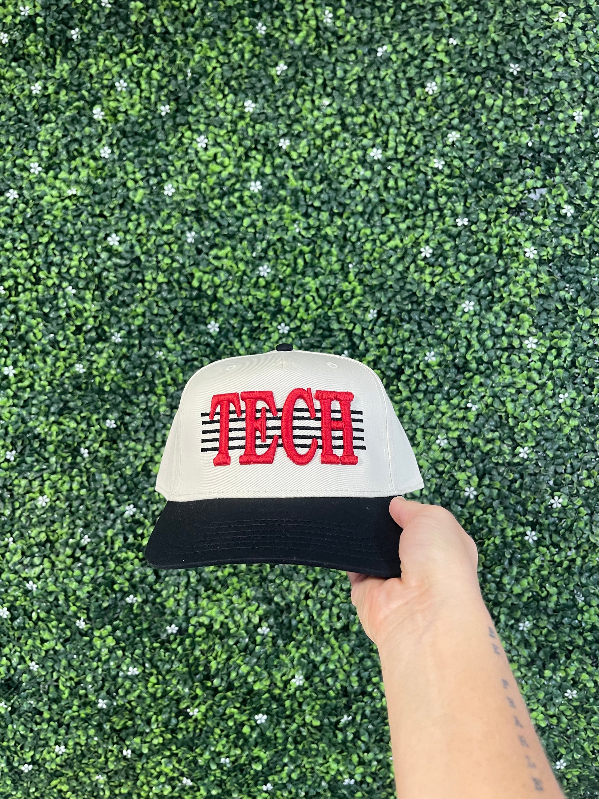 Cream/Black two tone canvas trucker hats. Mid profile.